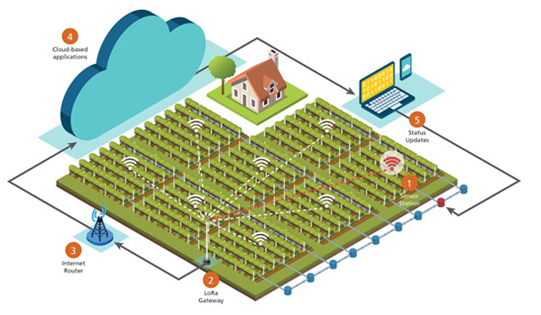 Trong lĩnh vực nông nghiệp, LoRa đóng vai trò quan trọng trong việc thu thập & truyền dữ liệu từ các cảm biến đặt rải rác trên diện tích lớn như trang trại, nhà kính, cánh đồng,… để giám sát nhiệt độ – độ ẩm đất, không khí, theo dõi pH & dinh dưỡng đất, đồng thời điều khiển hệ thống tưới tiêu tự động.