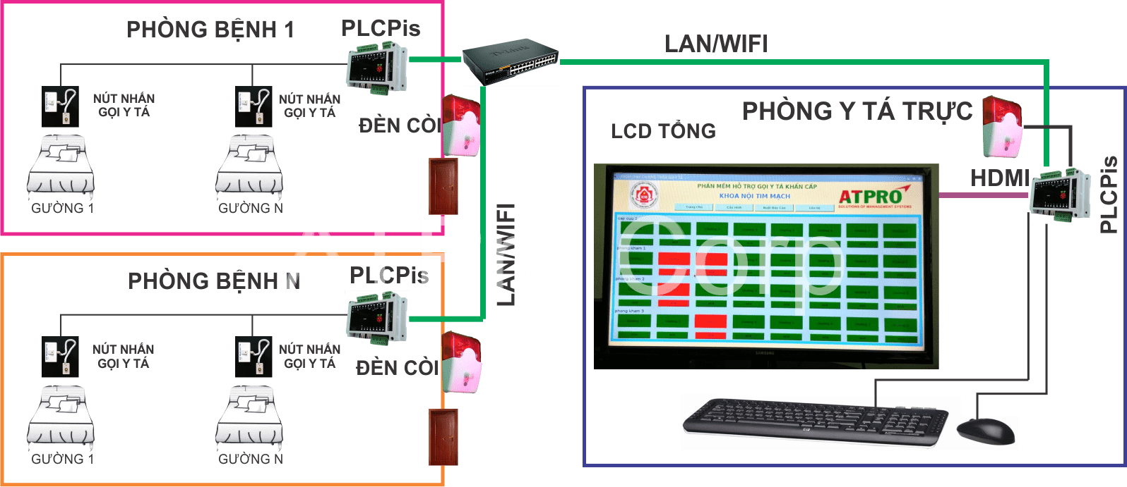 Bộ điều khiển phân tán PLCPis tại mỗi phòng bệnh có nhiệm vụ xử lý tín hiệu nút bấm chuông gọi y tá và đưa thông tin về bảng hiển thị LCD tại phòng trực y tá thông qua mạng Lan hoặc Wifi. Bộ điều khiển PLCPis tại phòng trực y tá nhận tín hiệu tại cái bộ PLCPis và xử lý tín hiệu tại mỗi phòng để hiển thị lên bảng LCD tổng.
