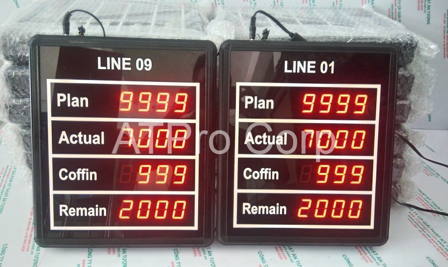 – Plan, Actual, coffin: nhập trực tiếp từ phần mềm quản lý năng suất xuống bảng hiển thị.
