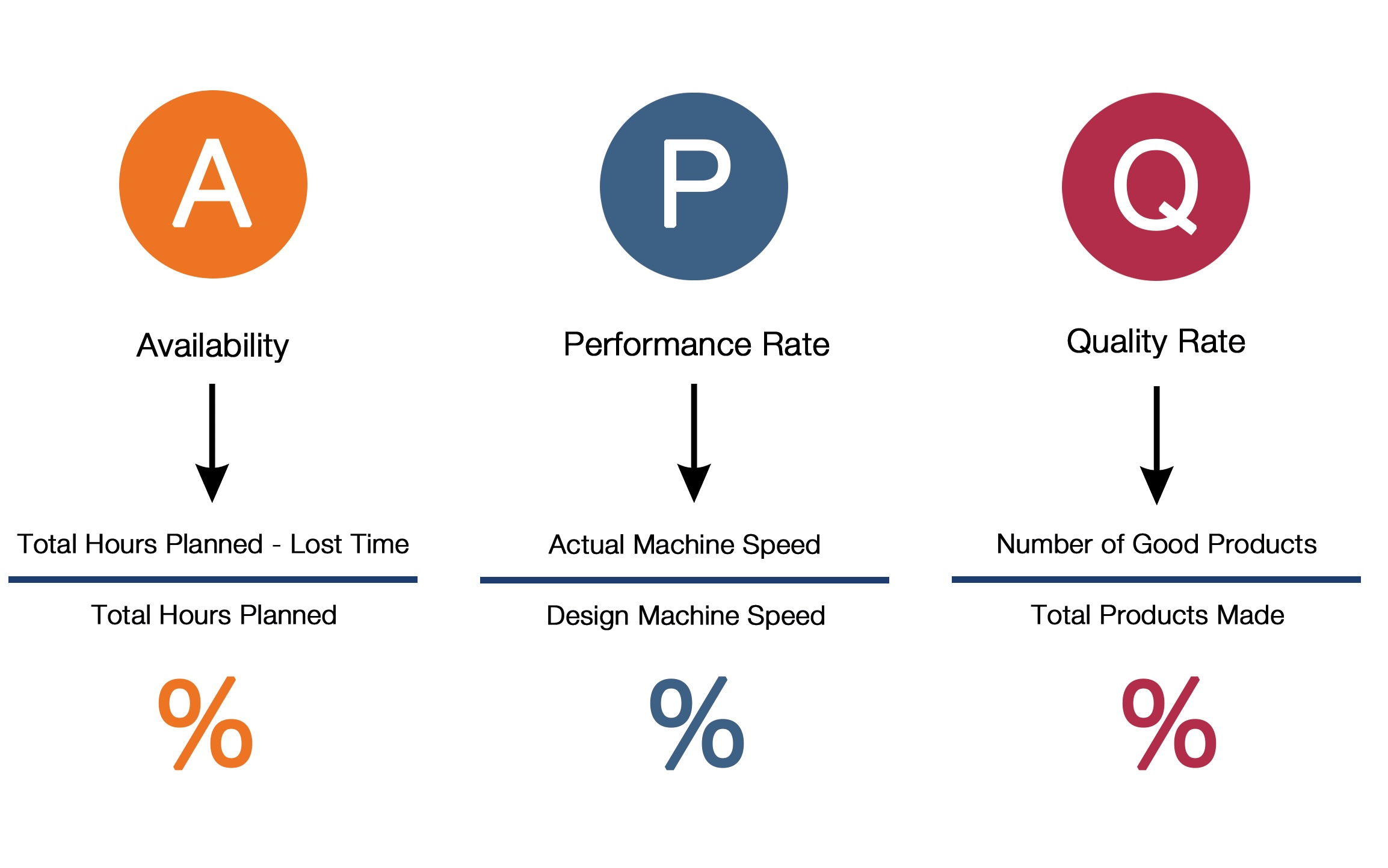OEE được xác định dựa trên ba yếu tố cốt lõi: Tính khả dụng (Availability), Hiệu suất (Performance) và Chất lượng (Quality).