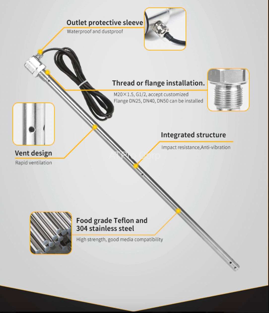Sử dụng vật liệu Teflon cấp thực phẩm và thép không gỉ 304. Với cấu trúc hàn hoàn toàn, ổn định lâu dài, độ tin cậy cao. Cảm biến có tính năng hiện đại và giao diện đơn giản, dễ sử dụng.