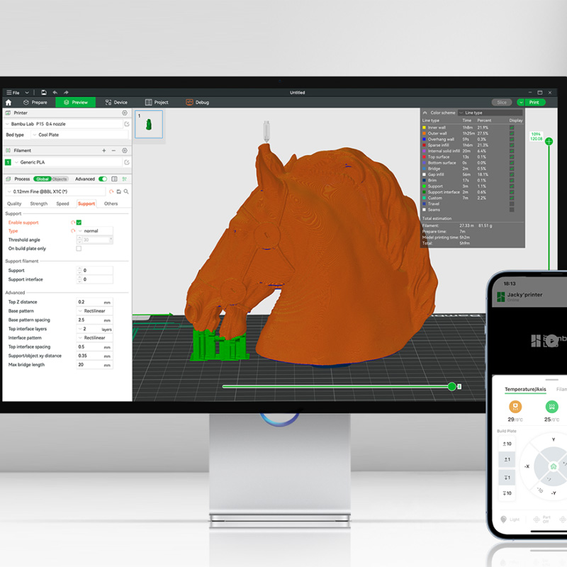 Bambu Lab A1 mini được tích hợp & đồng bộ với Bambu Studio & Bambu Handy, cho phép người dùng điều khiển, theo dõi & quản lý quá trình in từ xa một cách linh hoạt, tiện lợi. Đặc biệt, camera tích hợp sẵn trên A1 mini giúp giám sát trực tiếp quá trình in theo thời gian thực, đồng thời hỗ trợ quay video tua nhanh.